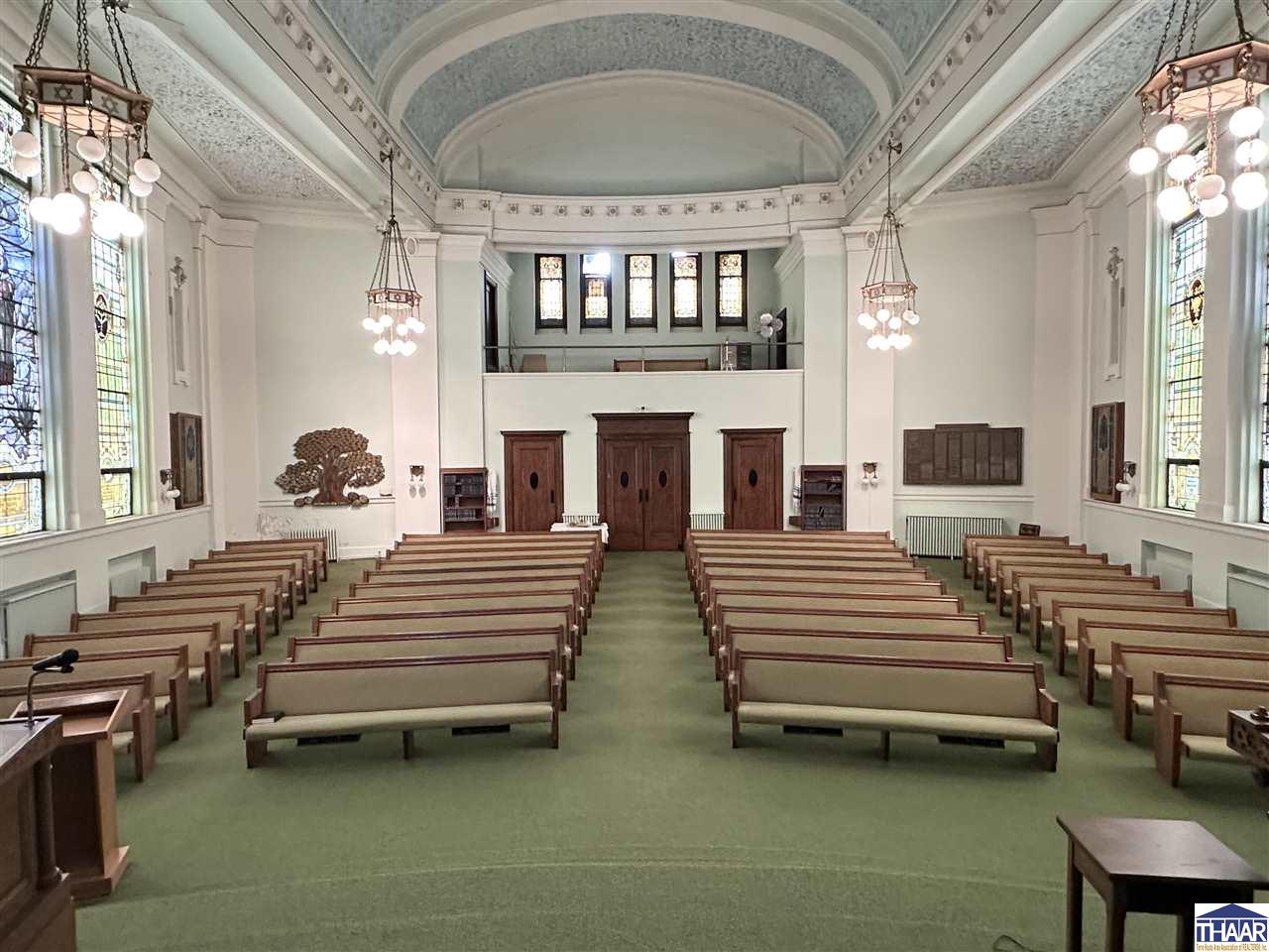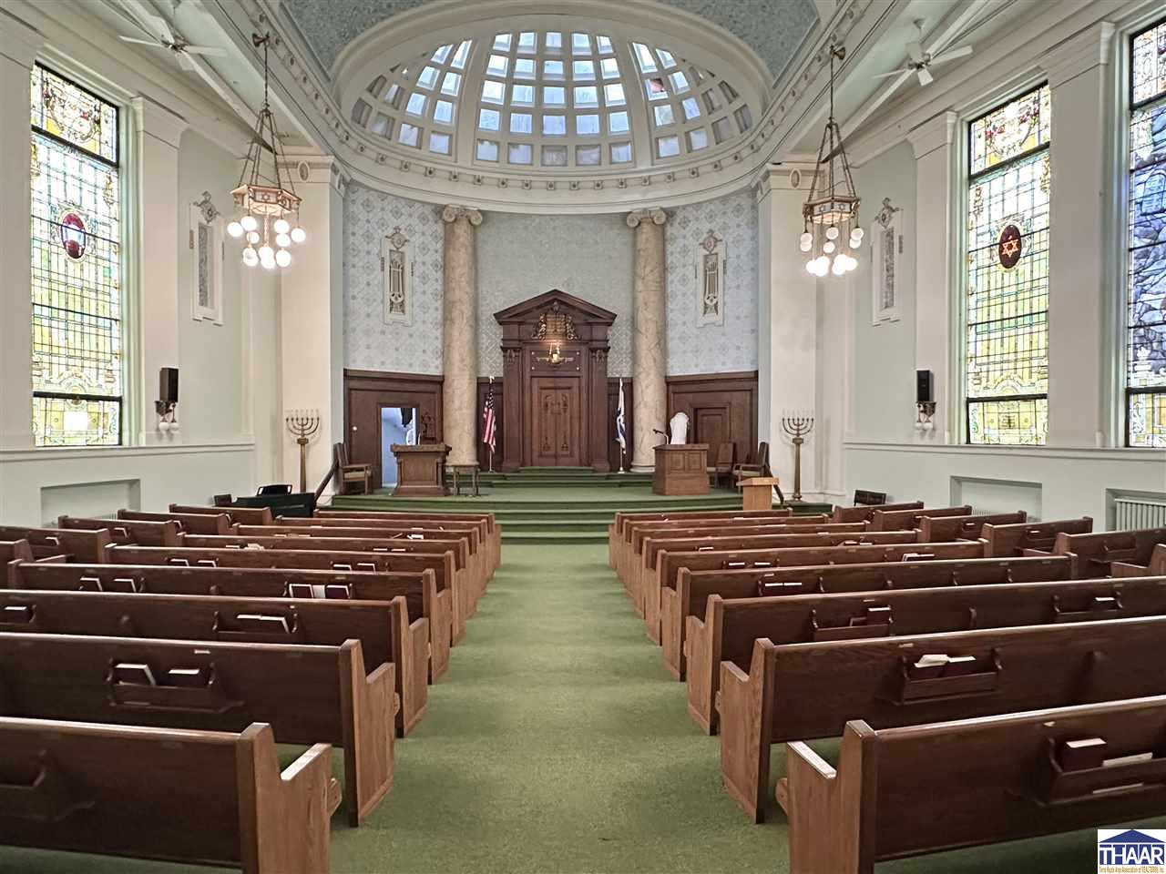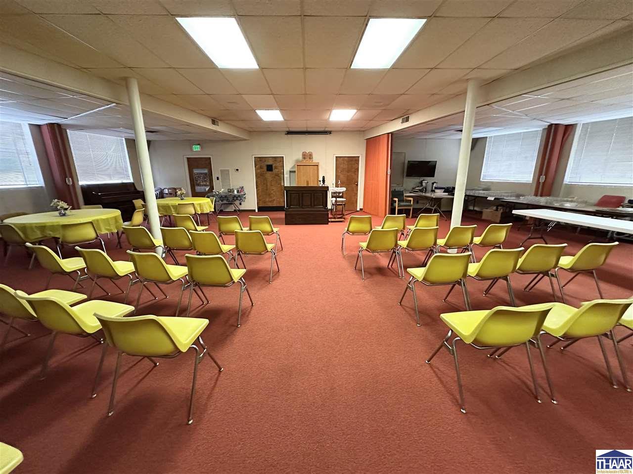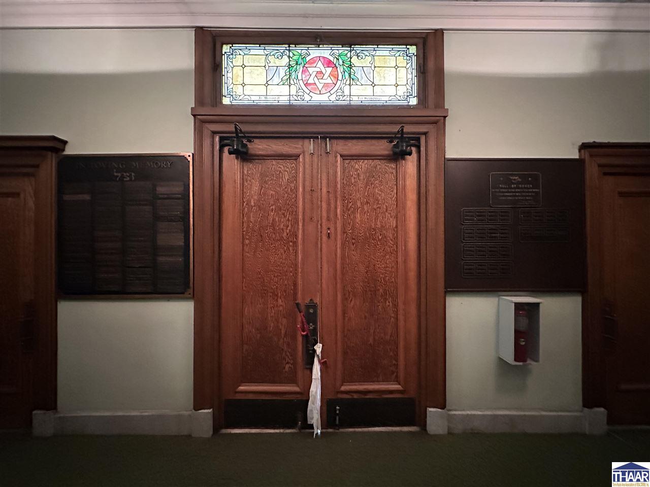 Opportunity to acquire the historic United Hebrew Congregation of Terre Haute, a well-maintained house of worship located in the heart of Terre Haute, Indiana. The property offers 8,666 finished square feet situated on a generous 1.095 acre lot, providing ample space for worship services, community gatherings, educational programs, or nonprofit operations. The main building features a traditional sanctuary along with functional and flexible interior space including two offices, two bathrooms, and a finished basement that can accommodate classrooms, meetings, fellowship events, or additional programming. A well-equipped kitchenette includes a nice stainless-steel sink, prep table, stainless-steel refrigerator, and oven with hood, making it ideal for hosting gatherings, community meals, and events. The property also benefits from paved onsite parking with approximately 30 parking spaces, ensuring convenient access for congregants and visitors. In addition, a secondary building of approximately 400+- square feet provides valuable extra storage or utility space. Situated on 1.095 acres in the heart of Terre Haute, this property offers strong accessibility and a unique opportunity for continued use as a house of worship or potential adaptive reuse for a church, nonprofit organization, community center, or educational facility. Schedule a showing Today!